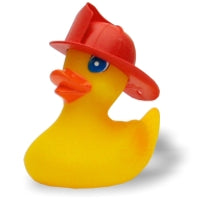 Klassische Badeente mit strahlend blauen Augen und abnehmbaren, roten Feuerwehrhelm