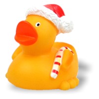 Ganz klassisch mit rot-weißer Zuckerstange und Nikolausmütze auf dem Birzel präsentiert sich diese niedliche Badeente